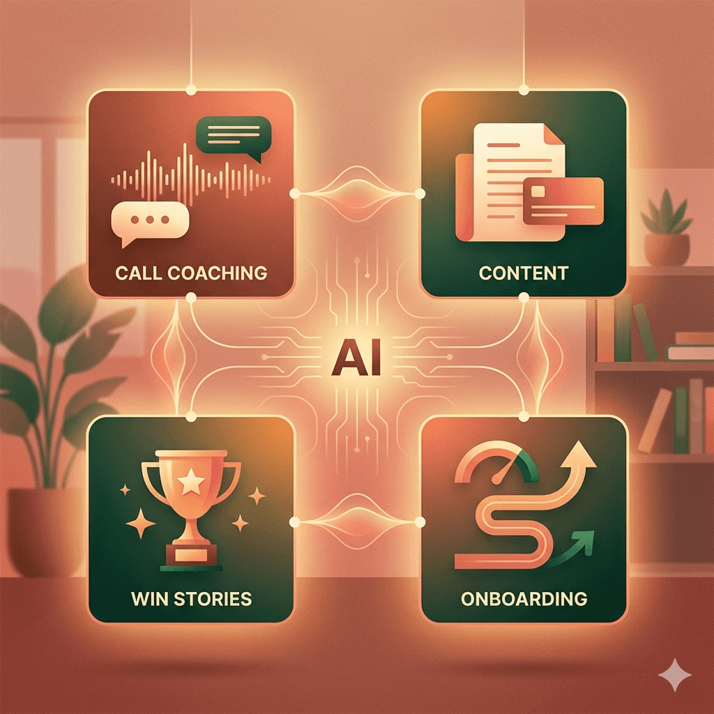 Personalized learning paths. Based on a rep's background and early performance, AI can sequence training differently for someone coming from a BDR role versus an experienced AE who switched industries.